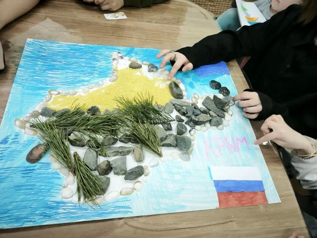 Самой интересной частью мероприятия стала творческая мастерская. Используя различные материалы - цветную бумагу, крупы, морские ракушки и камни, ребята коллективно создали красочную аппликацию, изображающую полуостров Крым. Каждый из воспитанников внёс свою лепту в общую работу, старательно выкладывая крупинку за крупинкой очертания знаменитого полуострова.