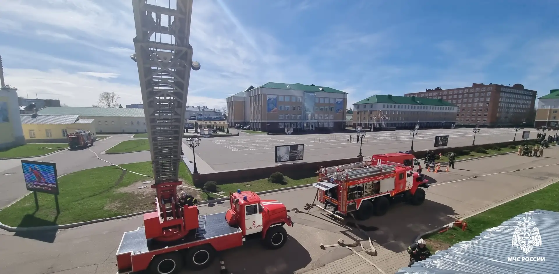 По легенде, на 2 этаже здания в одном из помещений произошло короткое замыкание электропроводки с последующим возгоранием. Огонь и едкий дым быстро распространились по всему зданию. В момент возникновения пожара дымовой датчик зафиксировал дым и передал сигнал на пульт управления, находящийся у дежурного. Согласно инструкции, дежурный персонал сразу же сообщил о происшествии в пожарную охрану. К месту возгорания были направлены подразделения Костромского пожарно-спасательного гарнизона по повышенному номеру вызова.