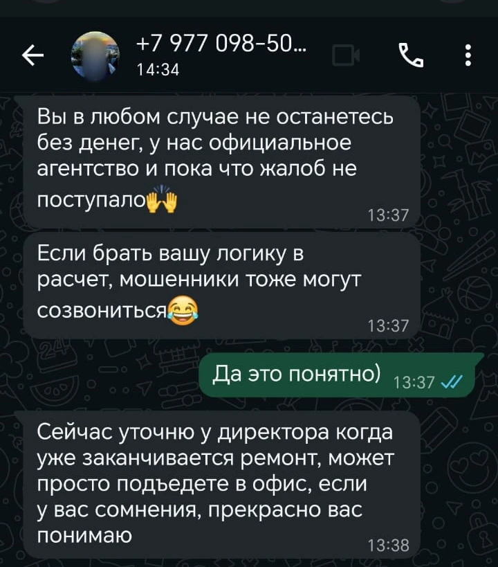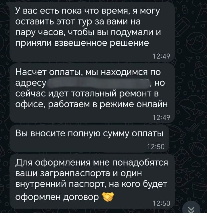 Клиент, опасаясь обмана попросил встретиться в офисе и заключить договор. Однако менеджер сообщила о глобальном ремонте в помещении и поторопила с принятием решения по покупке тура, сославшись на большое количество желающих.