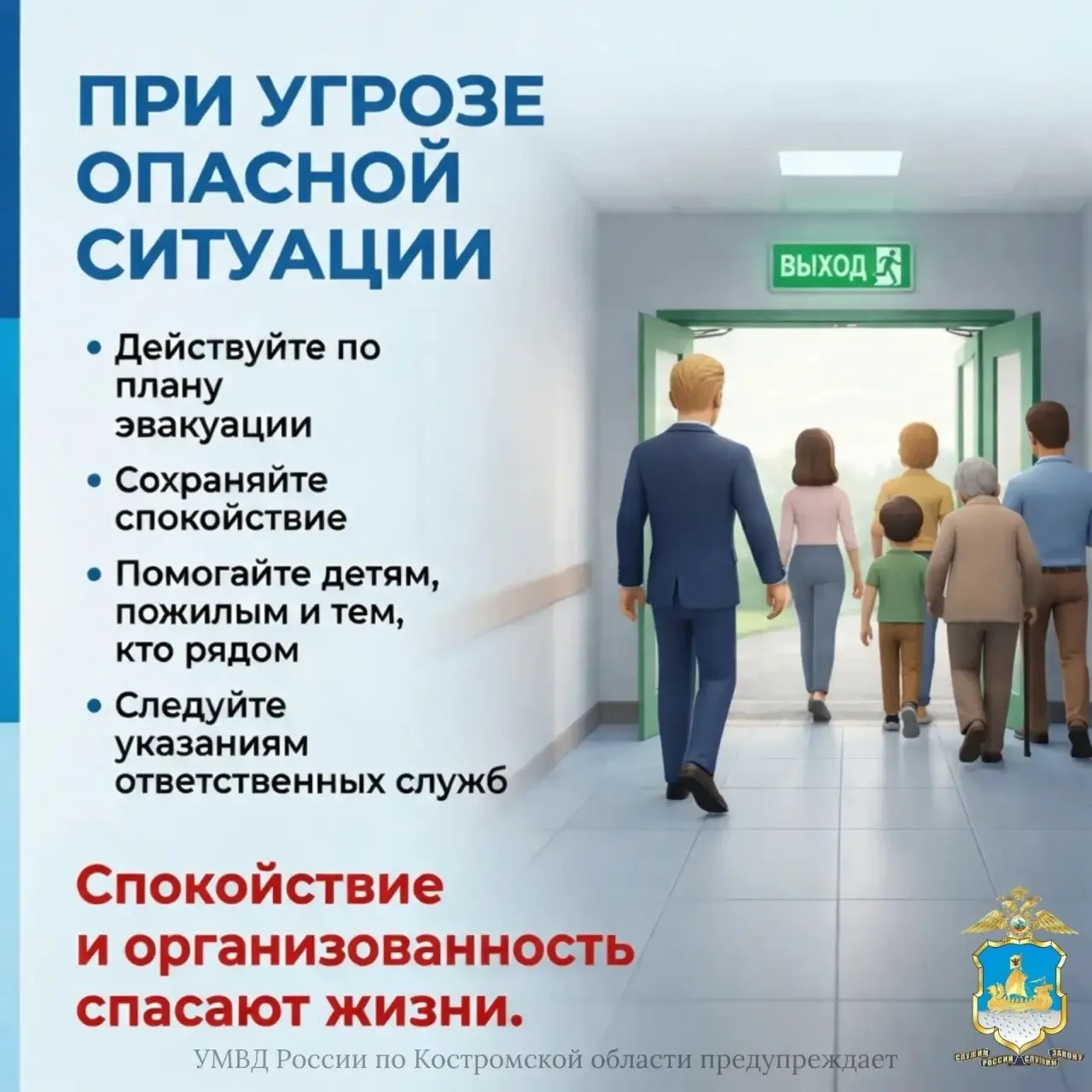 В любой нештатной ситуации главное — сохранять холодную голову. Если объявлена эвакуация, действуйте строго по плану и указаниям сотрудников. Помогайте тем, кому это необходимо: пожилым людям и родителям с детьми. Спокойствие — ваш главный союзник.