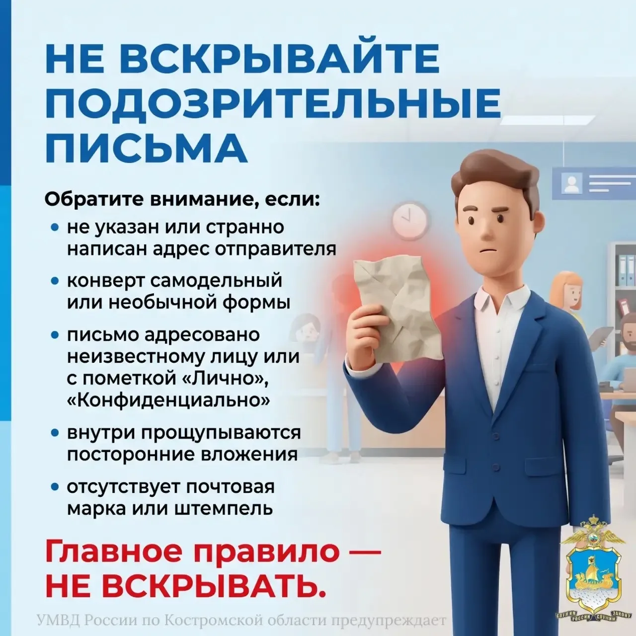 Не все письма приносят хорошие вести. Если вы получили конверт без обратного адреса, странной формы, с пометками «Лично» или если внутри прощупывается что-то необычное (порошок, проволока) — не вскрывайте его! Сообщите о находке специалистам.