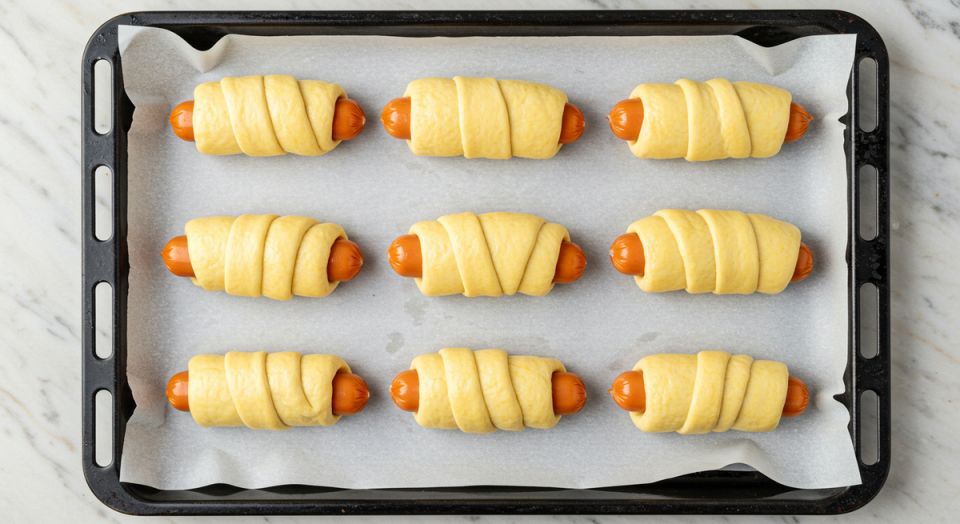 Теперь нарежьте тесто на полоски шириной около 3-4 см. Каждая сосиска нуждается в своей полоске! Оберните сосиску тестом, начиная с одного конца, как бы укутывая ее в теплое одеяло. После этого дайте заготовкам немного отдохнуть в тепле около 15 минут, чтобы тесто поднялось.