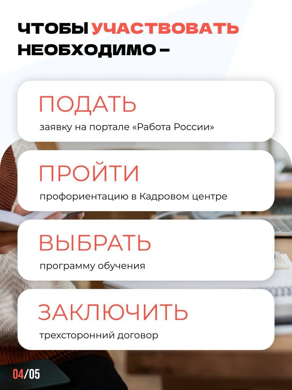 Заявки принимаются на портале «Работа в России». Пройти обучение можно по 186 востребованным специальностям: от токаря и швеи до менеджера по ИТ до экскурсовода. Не упустите свой шанс изменить свою жизнь и карьеру! Подробнее о возможностях смотрите в карточках.