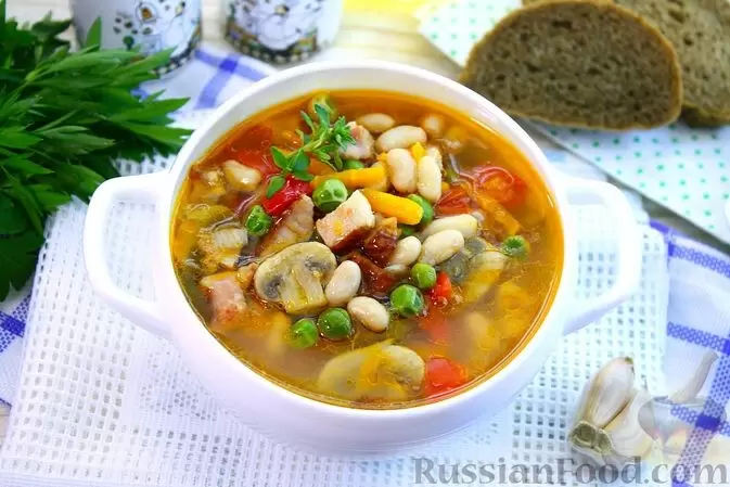 - Суп с овощами, беконом и консервированной фасолью: Быстрый в приготовлении и насыщенный, этот суп будет настоящей находкой для коротких летних вечеров.