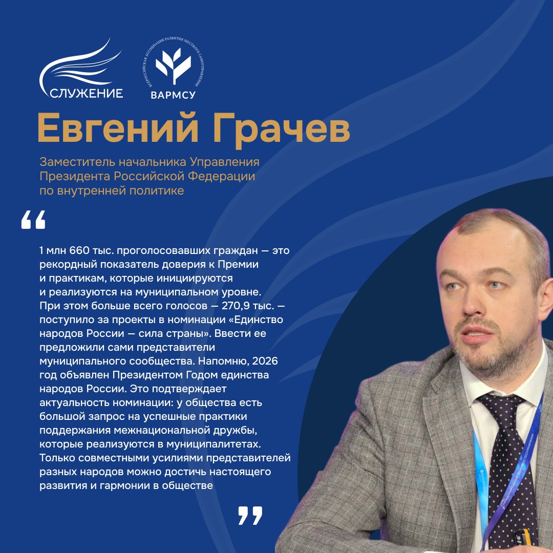 Всероссийская муниципальная премия «Служение» проводится по поручению Президента РФ Владимира Путина. Организатор - Всероссийская ассоциация развития местного самоуправления (ВАРМСУ) при поддержке Администрации Президента РФ.