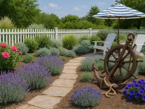 Декор в таком саду выполняет вспомогательную роль. Рассмотрите возможность использования морских элементов: якорей, канатов и миниатюрных лодочек, чтобы создать атмосферу, но не перенасыщать участок.