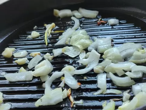 Начинают с разогрева сковороды с растительным маслом. Пока масло нагревается, лук нарезается и обжаривается до мягкости. После этого добавляется капуста, которую нарезают соломкой. Обжарить овощи следует до их слегка золотистой корочки, при этом не забывайте часто перемешивать.