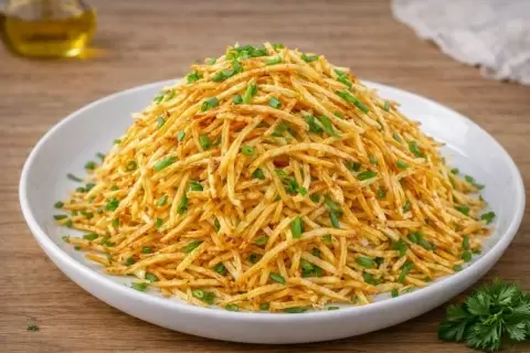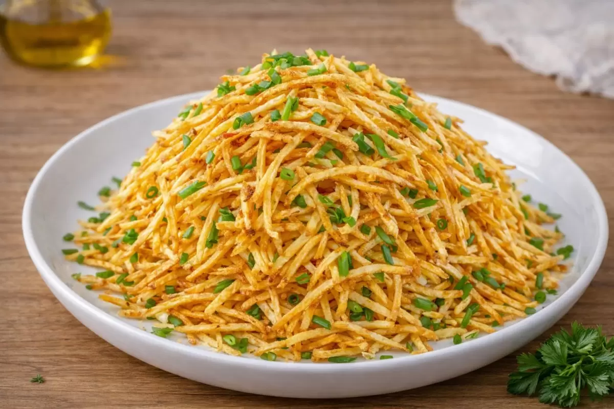 4. Выложите салат на большое блюдо, придавая форму купола. Сверху и по бокам обложите хрустящими картофельными палочками, формируя «муравейник». Перед подачей посыпьте зелёным луком.