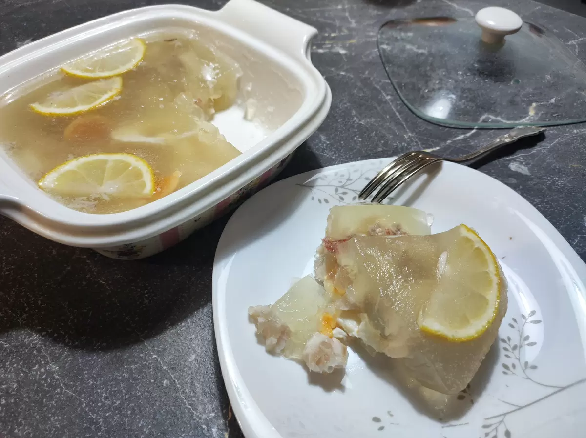 На поверхности заливного можно добавить дольки лимона. Хотя зелени не оказалось под рукой, это не критично для общего вида блюда. Когда заливное остыло, его поместили в холодильник, где оно быстро застыло. Заливные блюда очень полезны для суставов, и это стало третьим кулинарным экспериментом с желатином за неделю.