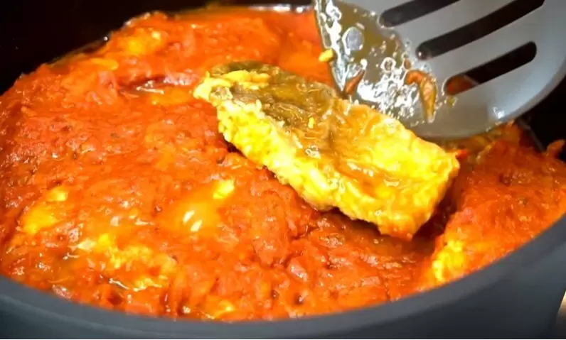 6. В большой кастрюле укладывают на дно слой лука и моркови, затем рыбу, повторяя слои. Заливают маринадом и накрывают крышкой. Довести до кипения на среднем огне, после чего уменьшить до минимального и оставить томиться на 1,5-2 часа.