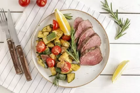 Подавать ростбиф на блюде вместе с гарниром из овощей, украсив ломтиками черри. Это великолепное сочетание порадует даже самых взыскательных гурманов!
