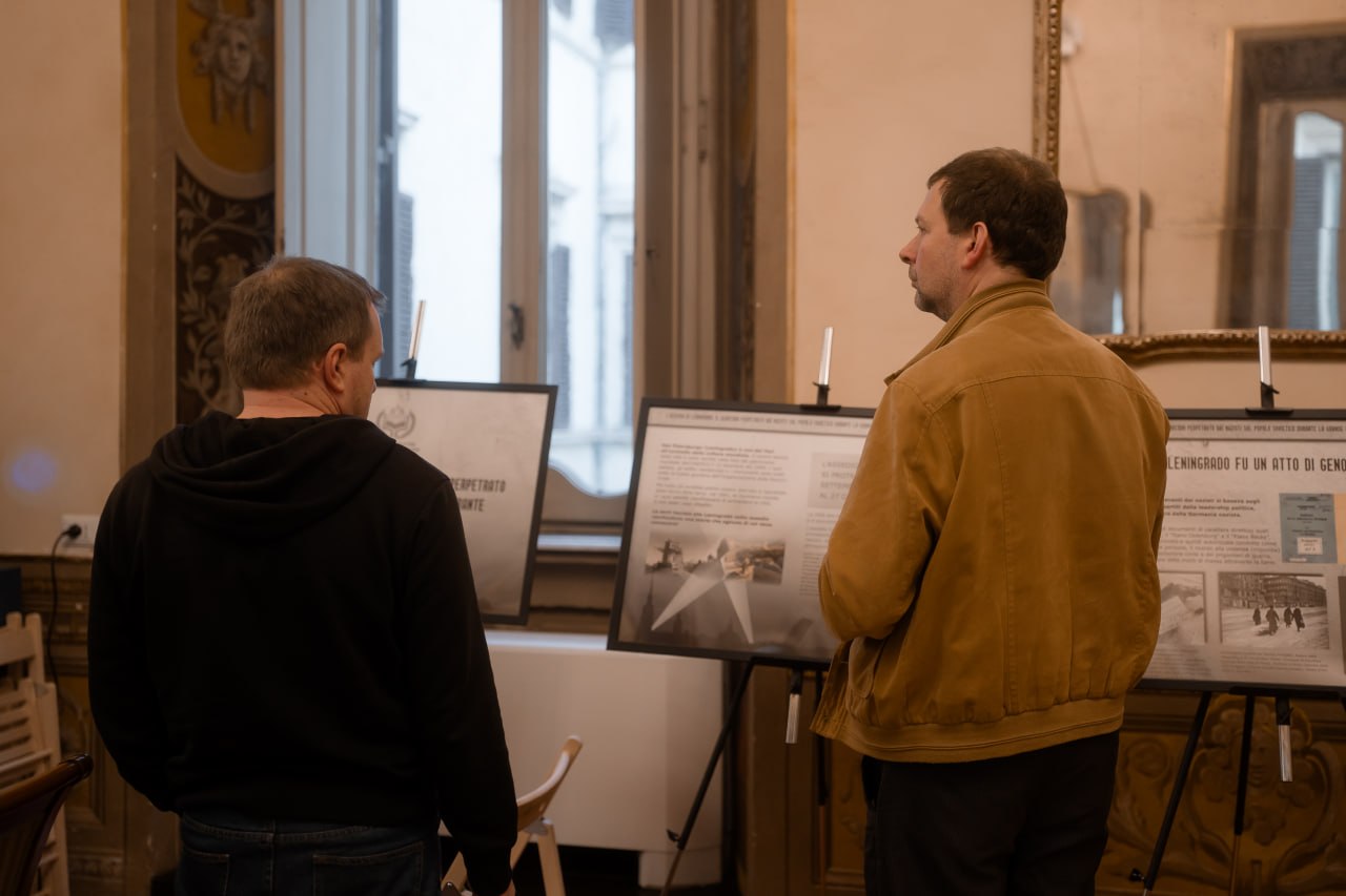 Экспозиция Национального центра исторической памяти при Президенте Российской Федерации «Блокада Ленинграда — нацистский геноцид советского народа во время Великой Отечественной войны»* организована при поддержке МИД России и Посольства России в Италии.