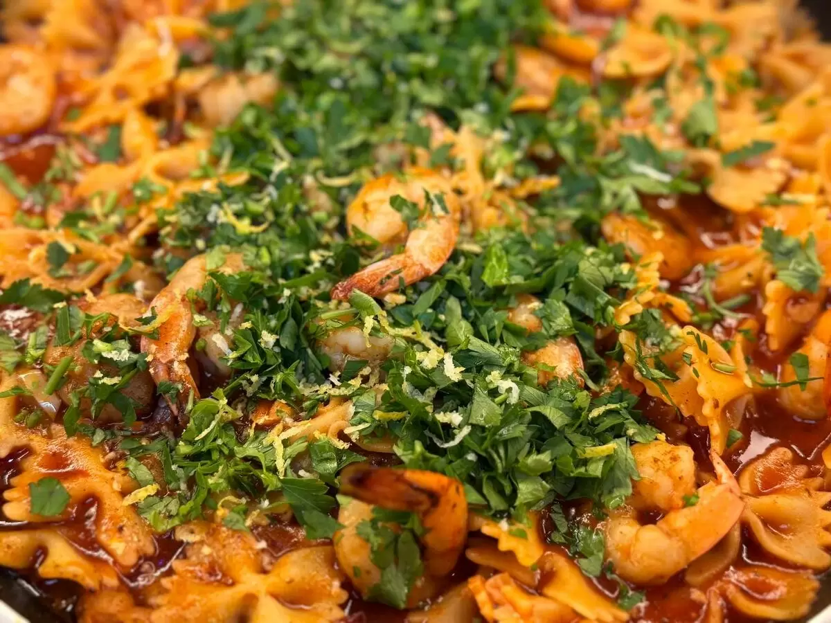 Тщательно разморозить креветки, очистить их, удалить хвостовые жилки и обсушить.На плите закипятить воду для пасты и разогреть сковороду для приготовления креветок.В сковороду добавить растительное масло и паприку, готовить около 30 секунд на среднем огне. Затем выложить креветки в один слой.Когда креветки начнут розоветь, перевернуть их, добавить коньяк и дать ему испариться.Пока готовятся креветки, следует бросить пасту в кипящую воду и сварить её на одну минуту меньше, чем указано на упаковке.Добавить к креветкам нарезанные помидоры, орегано, тимьян и сахар. При желании, можно добавить немного соли.Как только томаты закипят, перенести готовую пасту в сковороду с креветками, стараясь оставить часть воды из кастрюли.Посыпать все мелко нарезанным чесноком и тщательно перемешать, чтобы паста пропиталась соусом.Завершить блюдо рубленой петрушкой и, если есть желание, сбрызнуть соком лимона и посыпать цедрой.Такое восхитительное угощение точно украсит любой обед или ужин. За столом — настоящий ангел!