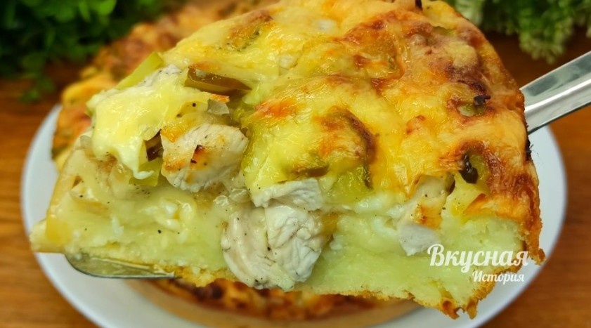 Начинка здесь знакомая и понятная: лук обжаривается до янтарности, к нему добавляется нарезанное филе индейки или курицы — минута за минутой превращая продукты в ароматное мясное существо полной насыщенности. Огурец маринованный добавляет характер и свежесть, а сверху — расплавленный сыр, окрасивший корочку золотистым оттенком.