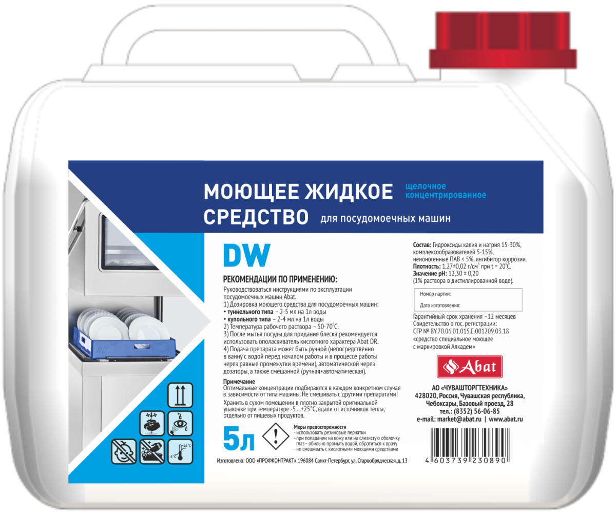 Абсолютный боец на кухне — средство Abat DW. Это концентрированное щелочное средство идеально подходит для ежедневного использования на посудомоечном оборудовании. Состав эффективно удаляет жир, остатки пищи и белковые загрязнения, подходя даже для нежной стеклянной посуды.