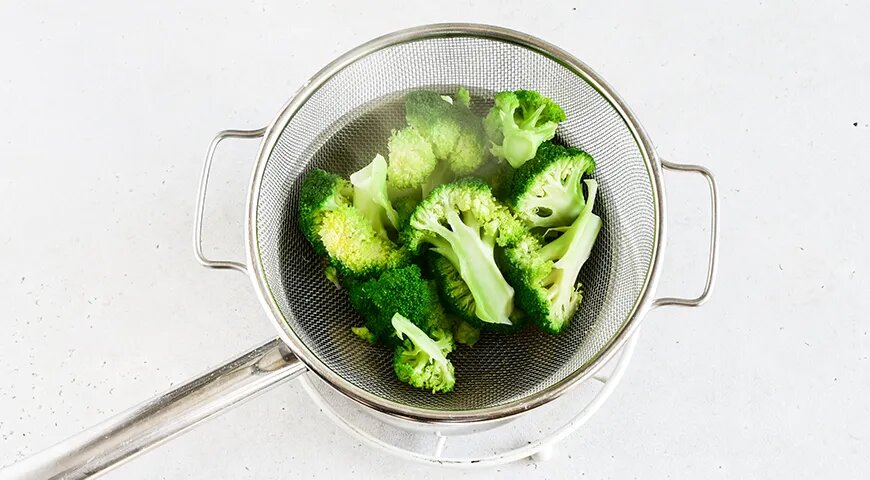 Чтобы начать, брокколи следует разобрать на мелкие соцветия и тщательно промыть под холодной водой. Затем доведите до кипения небольшую кастрюлю с подсоленной водой и аккуратно опустите капусту. Проварите её в течение трёх минут: она должна стать мягкой, сохранив при этом свой яркий цвет и хрустящую текстуру. После этого откиньте овощ на дуршлаг, чтобы избавиться от лишней воды.