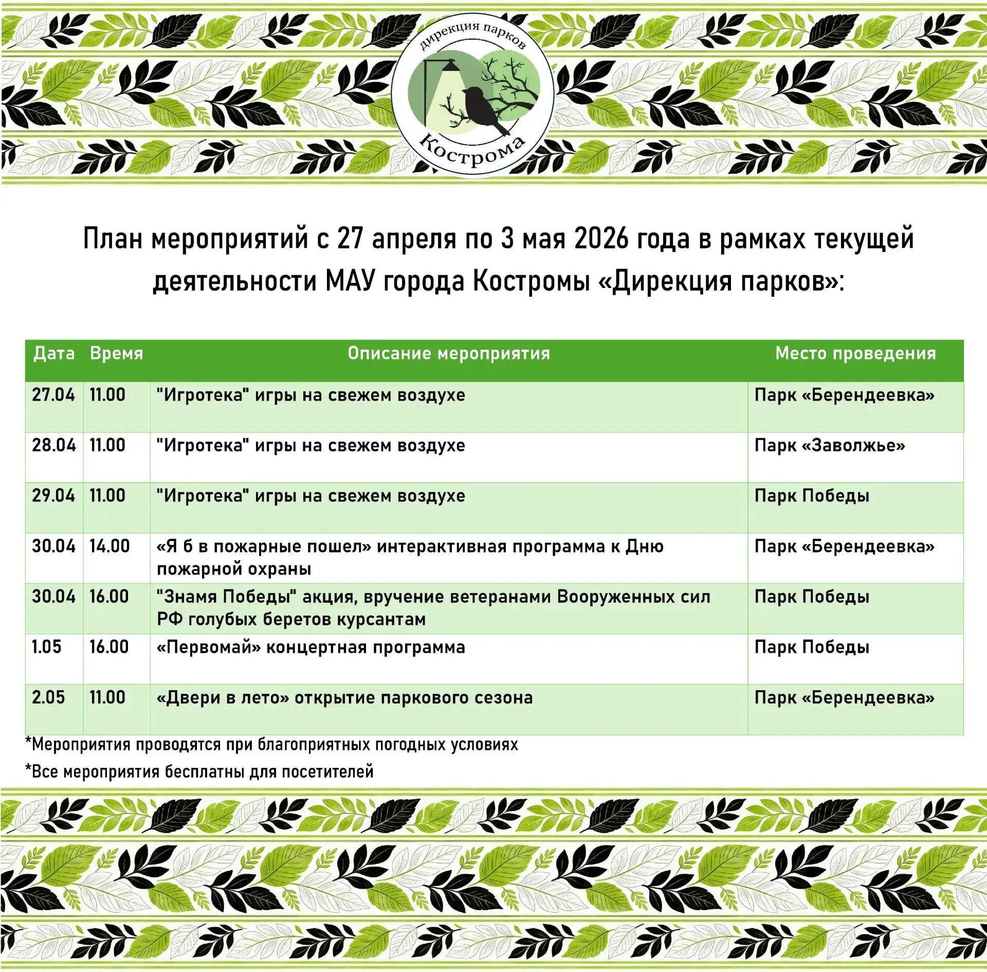 Рабочая неделя в парках начнется с «Игротеки». 1 мая у фонтана в парке Победы в 16:00 начнется концерт, посвященный Празднику Весны и Труда. А в субботу костромичей приглашают на открытие паркового сезона в Берендеевку. Подробная программа мероприятий - в афише дирекции парков.