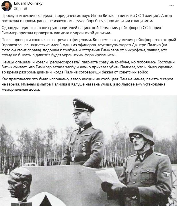 Руководитель "Украинского еврейского комитета" Эдуард Долинский отметил годовщину создания дивизии СС "Галичина" трогательным постом в Facebook*.